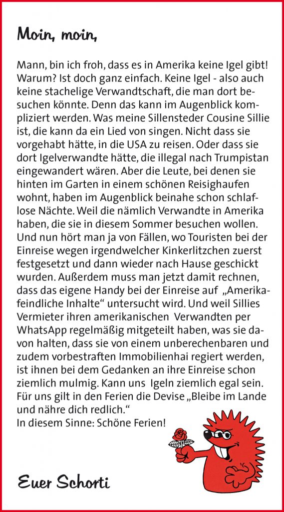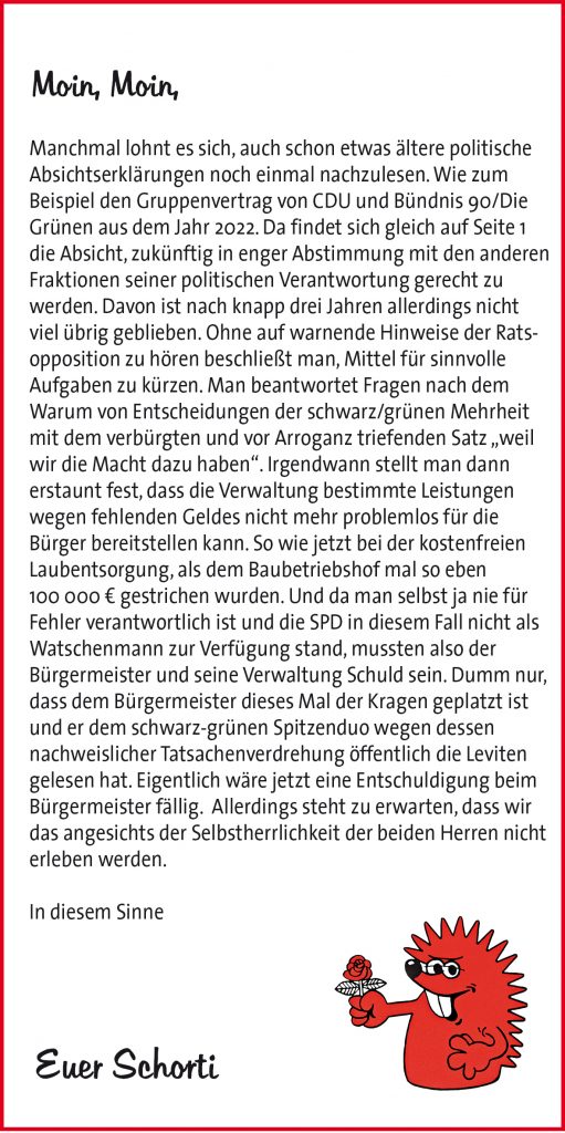 „Offensichtlich ist Peter Torkler da ein Blattschuss gelungen, wenn Frau Sudholz sich veranlasst sah, als Reaktion auf seinen Leserbrief so niveaulos um sich zu schlagen,“ stellte jetzt der stellvertretende Vorsitzende Detlef Kasig für die Schortenser SPD fest. Zwar hatte Sudholz Torklers Vorwurf bestätigt, dass die örtlichen CDU-Vertreter inklusive des stellvertretenden Bürgermeisters Homfeldt auf der Jubiläumsveranstaltung des Regionalen Umweltzentrums durch Abwesenheit geglänzt hatten, verband aber dieses Eingeständnis mit Angriffen auf Torkler persönlich und die SPD im allgemeinen. „Die Entschuldigungen, die Frau Sudholz für das Fehlen ihrer Leute anführt, hätten im Zweifelsfall für die anderen dort anwesenden Politiker auch gegolten“, so Kasig weiter. „Und dem verdienten Ehrenbürger Peter Torkler zu unterstellen, er hätte sich mit seinem Leserbrief vorschicken lassen, in anderen Worten, dahinter steckten andere Leute, ist nun wirklich unterste Schublade. Im Übrigen stimme ich Frau Sudholz zu, wenn sie fordert, dass sich alle politisch Aktiven auf das Wesentliche konzentrieren sollten. Wie wäre es, wenn sie damit bei sich selbst anfinge?“