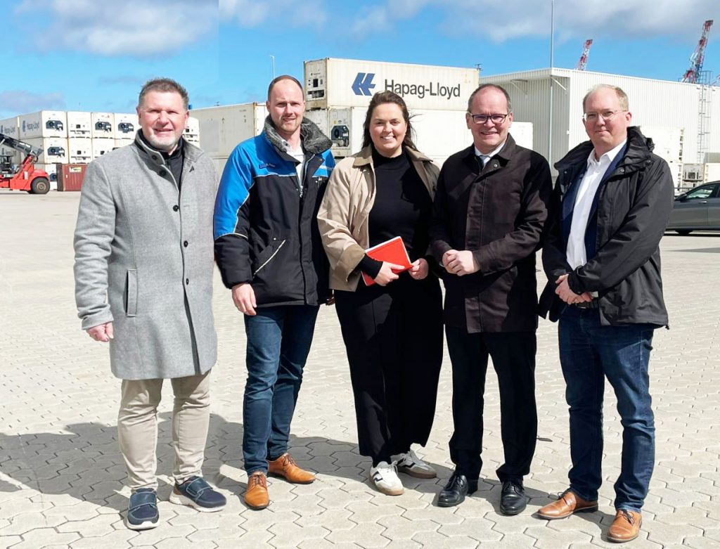 Foto von links: Detlef Kasig (SPD Vorsitzender Schortens), Sebastian Hajen (Nordfrost Niederlassungsleiter Wilhelmshaven), Ermana Nurkovic (SPD Bürgermeisterkandidatin Schortens), Grant Hendrik Tonne (SPD Wirtschaftsminister Niedersachsen) und Philipp Brandstrup (Nordfrost Geschäftsführer)